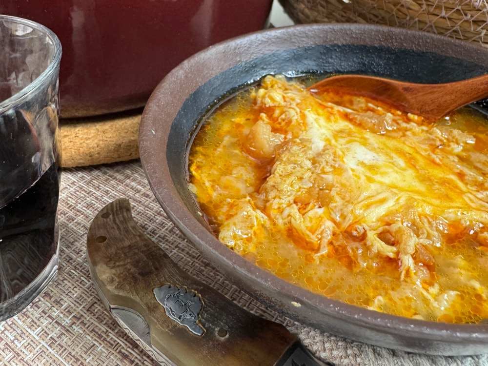 - Lower the heat to a minimum. First, beat two eggs in a bowl and pour them over the soup, stirring gently to create delicate ribbons of cooked egg throughout the broth.