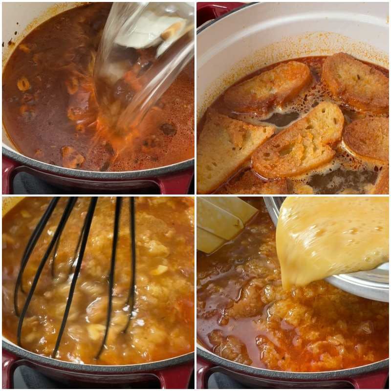- Add the fried bread slices to the pot, distributing them evenly. Let cook over low heat for about 10-15 minutes, until the bread soaks up the broth well but maintains some consistency. If you see that the bread absorbs too much liquid, you can add a little more water.