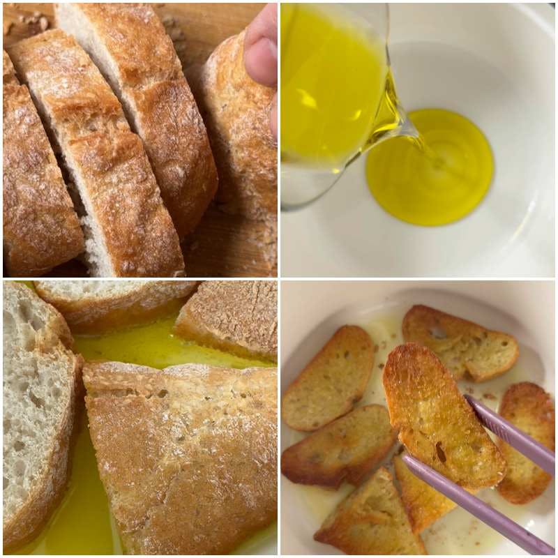 - In a traditional clay pot or heavy-bottomed pot, heat the olive oil over medium heat. Fry the bread slices on both sides until golden and crispy. Remove and set aside on a plate with paper towels to remove excess oil.