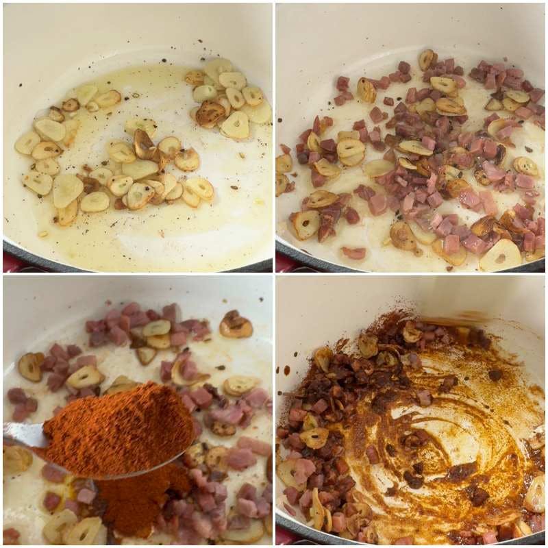 - Immediately after adding the paprika, put the pot back on the heat and add the water or broth. Bring to a boil and taste for salt (remember that the ham already adds salt). Let it boil for 5-10 minutes so the flavours integrate.