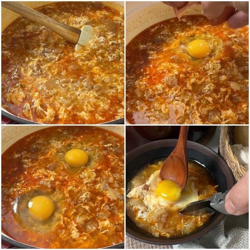 - Then, with a spoon, make four wells among the bread and crack one egg into each well, one per person. Let them poach gently until the whites are set, but the yolks remain creamy (about 3-5 minutes). This combination adds both texture from the ribbons and richness from the poached eggs.